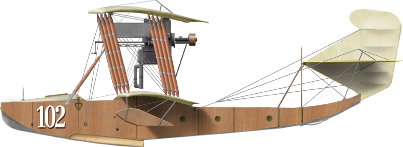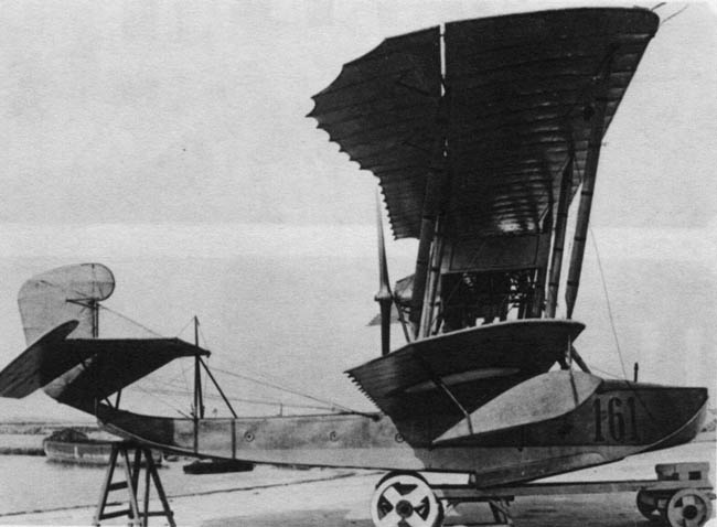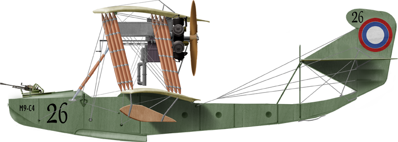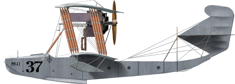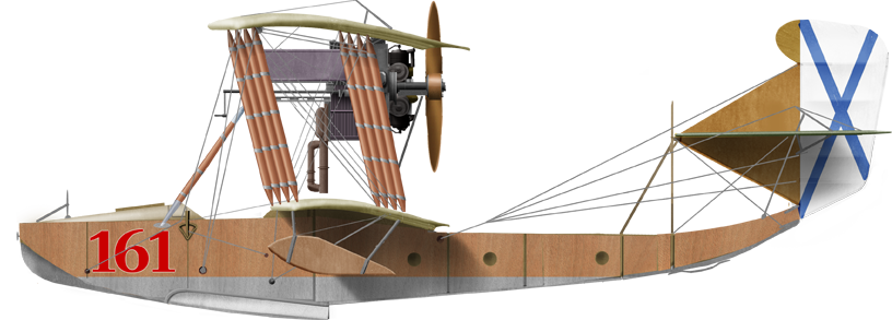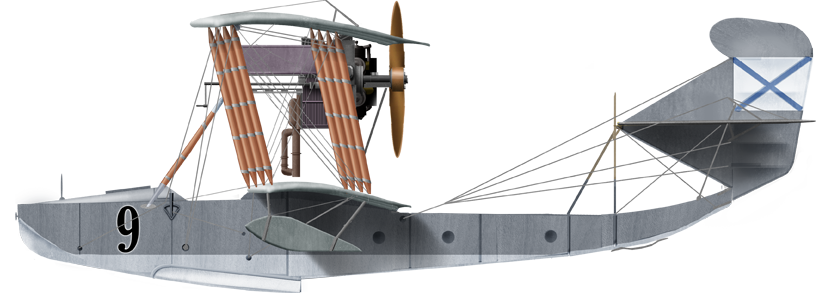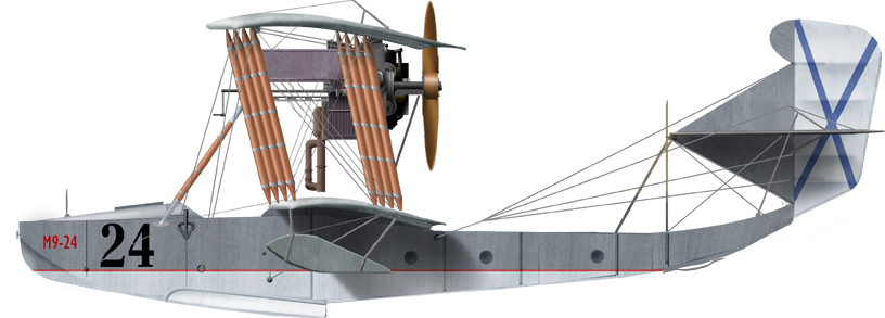 The M-3, was not entirely successful as a prototype, was a developent, a slightly modified M-2 with 100 hp Gnome-Monosoupape engine with a new wing profile was changed, with no improvementss in performances but better seaworthiness. Next came the M-4, a modified version of the M-3, same engine but new wing profile, hull modified, stabilizer with screw lift, and it was promising. This work culminated with the M-5 flying boat. It was designed in the spring of 1915, upon an urgent need, to face the German Empire, Austro-Hungarian and Ottoman Empires in the Baltic and Black Sea. The only Russian seaplanes in use at the time were foreign Curtiss Model K or French FBA flying boats, until the supply starved out. D. P. Grigorovich created a two-seater flying boat after constant improvements, making it fly in April, immediately showing a great improvement over the M3 and M4. It was greenlighted for production, construction was carried out in a brand-new facility. It delivered for the Russian naval aviation 183 of these. From July 1915 to June 1917 alone, 71 entered service for the Black Sea Fleet, 60 to flying schools. Some M-5s still flew during, and until the end of the Civil War for a grand total, final, of 300 aircraft, abeit the figure is still disputed among authors. It had been somewhat relegated however from 1916, to training, as operational flying boats were now mostly of the new M9 type. The M9 was also latter called the ShCh M-9, short for Shchetinin M-9.
