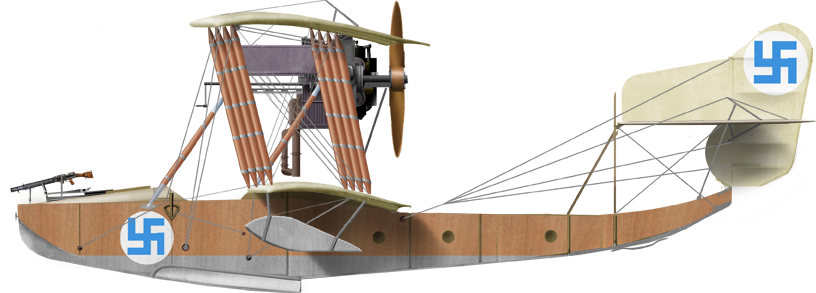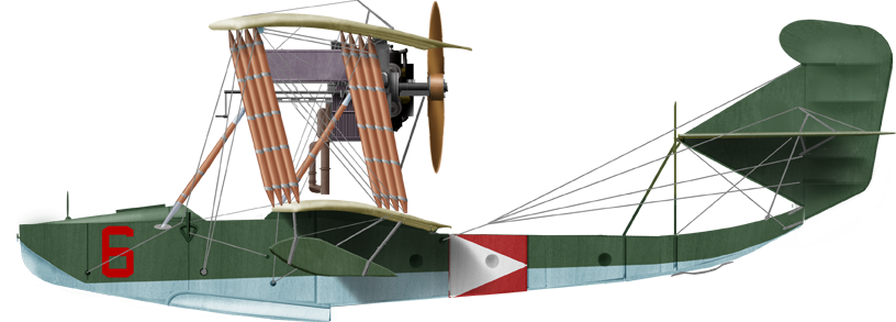 As said above, there was the main cabin large enough for two seats side by side, and without a windbreak. In front of theme cabin was the open gunner's station, with a flxeibly-mounted light machine gun. The standard type was the 7.7 mm Vickers, then 7.62 mm Maxim, both liquid cooled, before preferring the air-ccoled, lighter 7.65 mm Hotchkiss. However tests proceeded at the end of the war, to mount more serious firepower and deal some damaged to the ships encountered, either a 20 mm Oerlikon or a short 37 mm Puteaux cannon, light enough but lacking muzzle velocity. Other sources points out an Hotchkiss long barrel naval 2-pdr/37 mm but information is just lacking. Albeit it was stated they could carry bombs, they just lacked the output to carry many in addition to the rest, but it was done, as shown by their defensive strafing and bombing around Baku in the civil war.