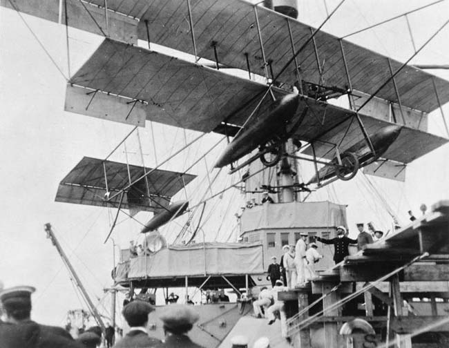 pre-dreadnought battleship HMS Africa had a flying-off platform constructed over the foredeck, over its forward 12-inch (305 mm) gun turret, a soluition that became widespread in 1917-18 in the Royal Navy. On 10 January 1912, piloted by Samson, the same modified No.38 flew off this platform while anchored off Sheerness. I was Britain's first successful aeroplane take-off from a ship. Later tests were also performed on the